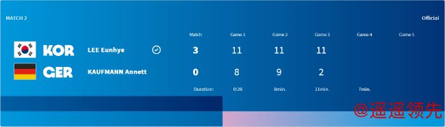 第二场女单,由李恩惠对阵安妮特-考夫蔓。现女单世界排名100位的考夫蔓是德国队在本届奥运会上收获的最大亮点,甚至在半决赛横扫了张本美和,爆出大冷。不过,本场比赛,考夫蔓虽然表现也是可圈可点,但还是无法与韩国的李恩惠抗衡。最终,李恩惠仅用时28分钟,就直落三局,以3-0(11-8/11-9/11-2)为韩国队再拿一分。