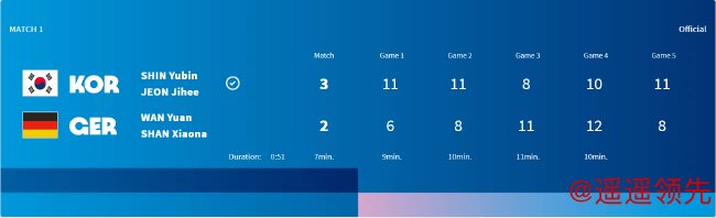 本场比赛,首场女双,由田志希/申裕斌对阵单晓娜/万远。前两局,韩国组合只用时16分钟,就以11-6和11-8连下两城。第三局,德国组合在一度落后4分的情况下,以11-8扳回一局。此后,又在第四局挽救1个赛点,以12-10再扳一局,双方大比分战成2-2。关键的决胜局,韩国组合在4-7落后的情况下,连续追分,最终凭借一波4-0,兑现了第2个赛点,问鼎娱乐平台以11-8再胜一局,大比分3-2(11-6/11-8/8-11/10-12/11-8)为韩国队先拿一分。整场比赛耗时51分钟。