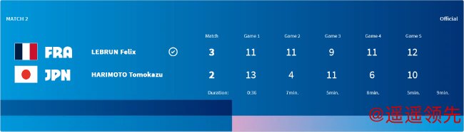第三局,双方继续比分紧咬,从2平战至4平。户上在3-4时连下3分,6-4拉开分差。双方各下1分后,A-勒布伦连追2分追成7平,又在7-8落后时连下3分,10-8反超拿到局点,并以11-9扳回一局。第四局,A-勒布伦开场2-0、4-2领先。户上隼辅随后接连追成5平6平,并在6-8落后时打出一波4-0,10-8拿到赛点,并以11-9再胜一局,大比分3-1(11-8/11-9/9-11/11-9)为日本队扳回一分,总分追成1-2。整场比赛用时34分钟。