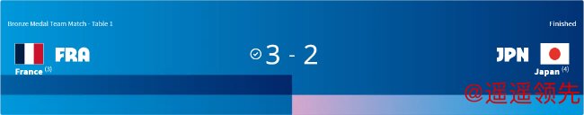这样,3号种子、东道主法国男团总比分3-2战胜4号种子日本男团,夺得铜牌,这也是F-勒布伦在本届奥运会上拿到的第2枚铜牌。而三线出战的张本智和在本届奥运会上颗粒无收。