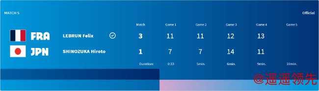 双方回到同一起跑线。第五场男单,由篠塚大登对阵F-勒布伦。首局,日本小将开场4-1领先。F-勒布伦紧紧追赶,在3-5落后时打出一波5-0,8-5反超。篠塚大登追至7-9后,法国人连下2分,以11-7先下一城。第二局,日本小将在1-2落后时连下3分,4-2反超。F-勒布伦追回1分后,日本队叫暂停。暂停回来,法国人再下2分,5-4再次领先。篠塚大登追至5平后,F-勒布伦连下4分,9-5领先。双方各下1分后,法国人10-6拿到局点,并以11-7再下一城。