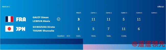 本场比赛,首场男双由户上隼辅/篠塚大登对阵A-勒布伦/高茨。首局,法国组合在0-1落后时,打出一波7-0,以7-1反超并拉开分差。日本组合连追3分后,法国组合再拿2分,9-4领先。日本组合再追1分后,法国组合连下2分,11-5先下一城。第二局,法国组合开局4-1领先,日本组合追至3-5后,法国组合又连下2分,7-3领先。接下来的发展和第一局一样,再次战至9-5。此后日本组合追回2分,但法国组合也是连下2分,11-7再胜一局。